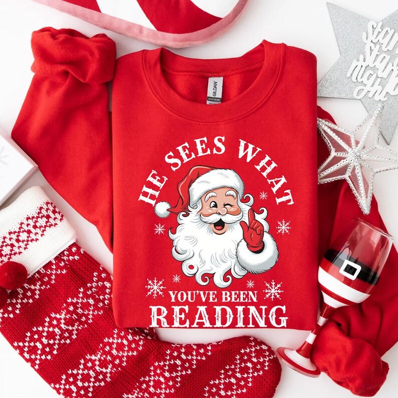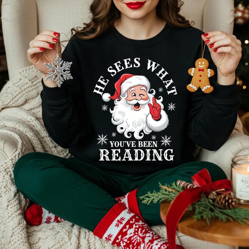 Comfort Colors He Sees What You’ve Been Reading Santa Shirt, Funny Bookish Christmas Santa Shirt,Christmas Book Shirt, Gift For Her