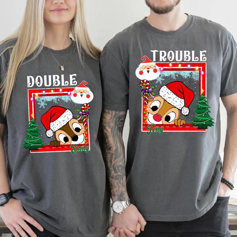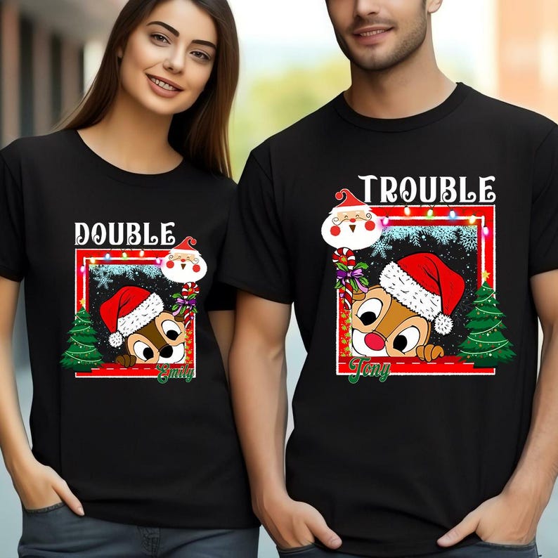Custom Name Chip & Dale Double Trouble Disney Christmas Shirt, Christmas Disney Family Vacation Personalized Shirt, Chipmunks Gifts