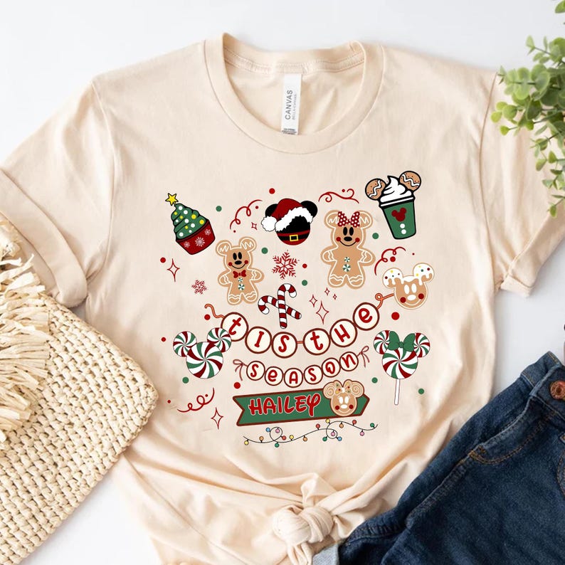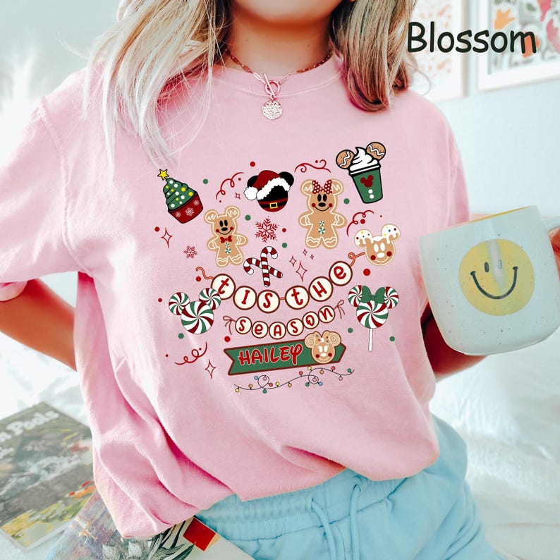 Custom Name Christmas Mickey Gingerbread Shirt, Personalized Holiday Tee, Cute Pink Winter Disney T-shirt, Gift for Girls, Festive Xmas Top