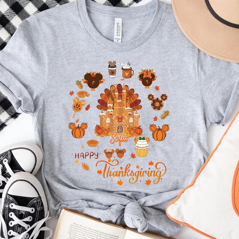 Custom Name Disney Thanksgiving Castle Shirt, Personalized Happy Thanksgiving Tee, Custom Name Fall Treats Shirt, Pumpkin Autumn Tee