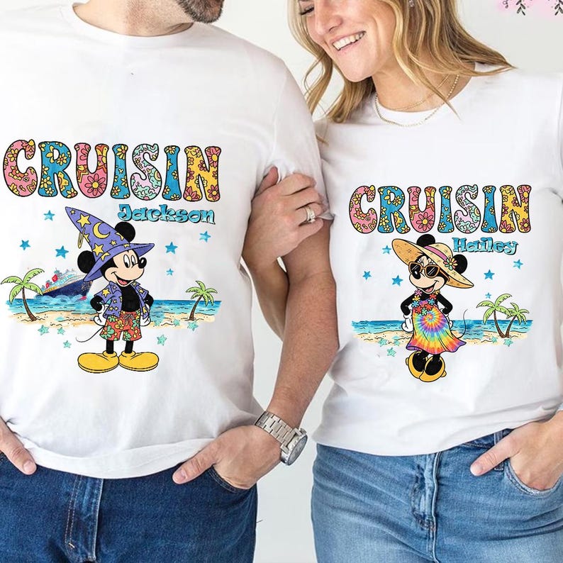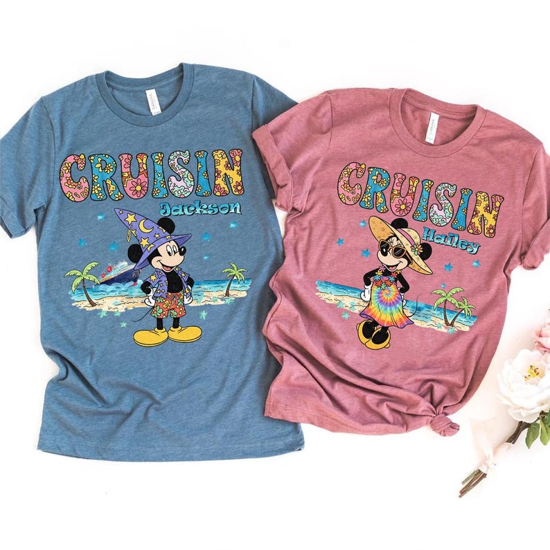 Retro Cruisin Disney Vacation Custom Name Shirt, Personalized Mickey and Minnie Beach Tee, Custom Family Cruise T-shirt, Floral Summer Top